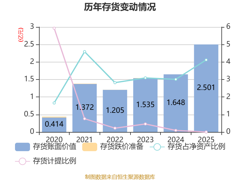 从存货变动来看,截至2025年末,公司存货账面价值为2.5亿元,占净资产的4.12%,较上年末增加8528.87万元。公司本期没有计提存货跌价准备。