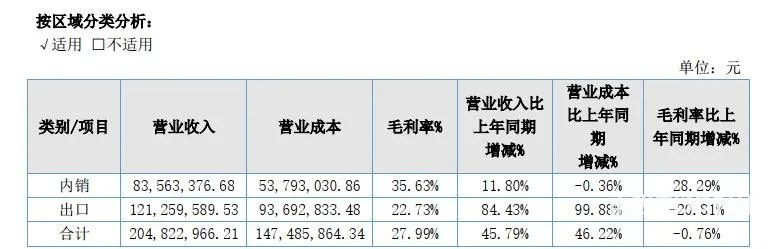 报告显示,出口营业收入达到1.21亿元,同比增长84.43%,占总营收60%,内销营业收入8356万元,同比增长11.80%,其中亚马逊销售额为1970万元,占比9.58%,位列第一。