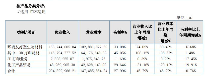 1、报告期内“营业收入”同比增加 46.17%,主要是“环境友好型生物材料” 收入增加明显,实现 1.54亿元销售,同比增长 74.05%;