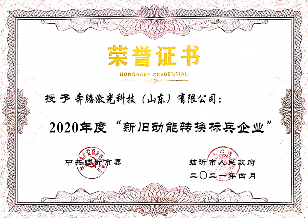 会议对临沂市功勋企业家、行业领军企业家、优秀企业家和新旧动能转换标兵企业进行了表彰,奔腾激光科技(山东)有限公司荣获“2020年度新旧动能转换标兵企业”。