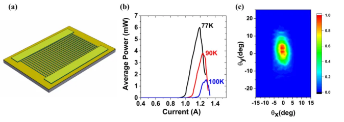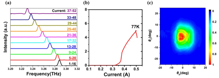提高激光器的平均输出功率、降低器件的功耗对实现小型化激光器系统至关重要。为此提出了基于偶极天线阵列的THz-QCL谐振腔。单纯的偶极天线具有极高的辐射损耗,无法作为激光器的谐振腔。我们利用芯片键合技术在天线阵列下方置入反射镜,将偶极天线激发的反向传播的电磁场变成同向干涉,并控制干涉相位进而控制辐射效率。提出的结构可以灵活控制激光辐射效率、提高散热效率、降低光束发散角。图3为激光器原理图和代表性测试结果。77K时的激光平均功率可达约6 mW。器件具有良好的单瓣光束,半高全宽为4.5°×16°。激光器呈现单模激射,边模抑制比大于20dB。