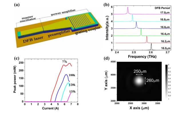 图2:(a) THz-QCL激光器与放大器单片集成的原理图。
