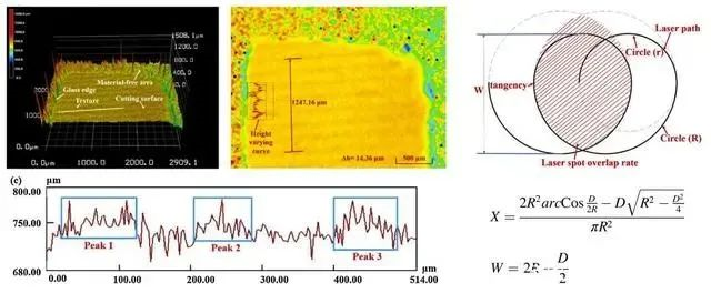 一年多以来,项目组对硬脆玻璃激光切割工艺及机理开展研究。硬脆玻璃在航空航天、光伏、汽车、高端建筑等领域应用广泛,有关硬脆玻璃激光切割工艺与质量保证技术的研究,是近年研究热点、难点。项目组对工件毛刺缺陷的形成机制和表面粗糙度值随激光偏移距离的指数增长模型进行了研究,形成了低崩边约束的工艺参数优化方法,使工件表面粗糙度由7μm降低为5μm。同时,项目组对表面条纹的形成机制进行了研究,建立了螺旋线的宽度和重叠率对切割条纹宽度与高度的解析模型,实现了条纹形态的准确预测(螺旋线宽度0.55mm、重叠率65%情况下,条纹间距和Rz预测值为177.98μm、17.87μm,试验值分别为178.16μm和14.36μm)。该成果为形成稳定硬脆玻璃激光切割工艺有重要价值。