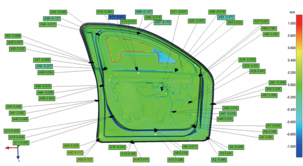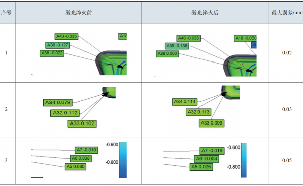 由于淬火区域大,常规的火焰淬火或感应淬火都会使工件产生较大的热变形,导致模具精度无法保证,进而需要增加其他的工艺手段来保证,这样势必造成模具的加工周期长,且易出现硬度不稳定的情况。因此,我们改为采用激光淬火方式,这样工件变形极小,甚至无变形,不需增加其他工艺手段即可达到质量要求。如图3和表1所示,我们采用激光淬火方式对某车型的门内板进行淬火处理,通过蓝光扫描检测淬火前后的型面变化情况,得知激光淬火后的模具型面能满足精度要求。
