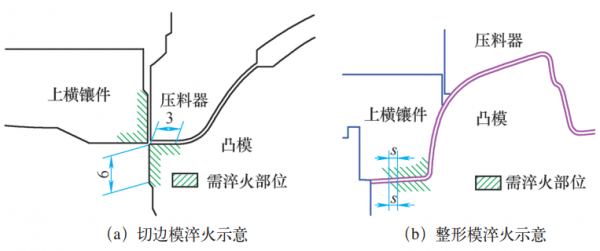 汽车模具上的镶件表面淬火,主要指切边模的切边镶件刃口淬火和整形模的整形镶件整形部位淬火,如图4所示。