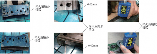 经过研究和实践,我们发现激光淬火可以有效地控制镶件变形和硬度不合格的问题。图5所示是切边镶件和整形镶件的激光淬火硬度情况和变形情况,从图中可看出,镶件采用激光淬火后硬度稳定、变形很小,实现了精加工后淬火的制造工艺,有效提升了加工效率,节约了加工成本。