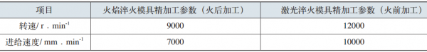 采用激光淬火的模具,淬火前型面精加工到位,这样既避免了去变形加工工序,又提升了精加工的效率。以某机床为例,表2是采用火焰淬火方式和激光淬火方式模具精加工的参数情况,采用激光淬火方式的模具加工效率比采用火焰淬火方式提升了30%以上。