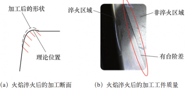 由于火焰淬火采用先淬火再精加工的方式,型面存在硬度不一致的区域,刀具在切削过程中存在受力不均、易磨损的情况,从而导致型面加工质量较差,如图7所示。