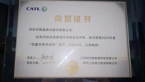 5月14日,江苏时代&时代上汽供应商表彰大会在江苏时代新能源科技有限公司隆重召开,深圳市联赢激光股份有限公司总经理贾松先生、营销中心总经理何英巧先生应邀出席,并荣获2020年度“质量优秀供应商”称号!