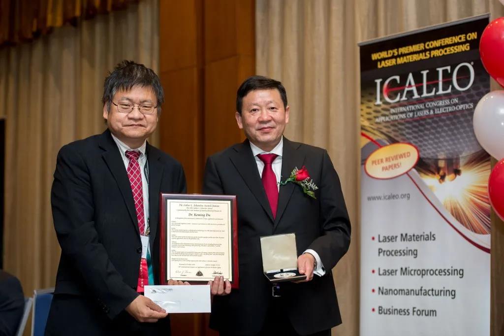 美国激光学会主席陆永枫教授(图左)为杜可明博士(图右)颁奖