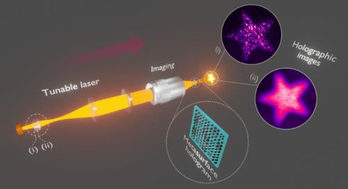 图1. 可调谐激光源、超表面全息图和投影全息图的图示