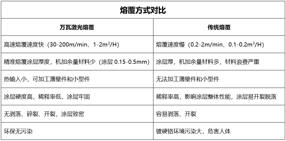 以零部件修复为例,传统的埋弧焊、堆焊、等离子、TIG焊、MIG焊等工艺,由于热影响区非常大容易导致变形,从而影响零部件性能。相对而言,激光熔覆工艺具有变形量小,适用于硬度更高材料,更加适合精密零部件或大尺寸零部件修复,后期加工成本小,可广泛应用于汽车模具、石油石化阀门、电机轴修复等领域。