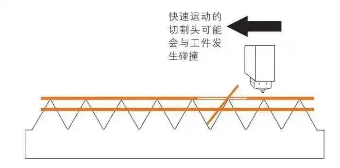 激光切割在加工时,板料被锯齿状的支撑条托住,被切割下来的零件如果不够小,就不能从支撑条的缝隙中落下;如果不够大,就不能被支撑条托住,则可能失去平衡,发生工件翘起。而高速运动的切割头可能与之发生碰撞,轻则停机,重则发生损坏,如图6 所示。