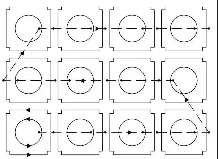 而所谓的集中穿孔,就是将整张板料上的所有穿孔过程提前集中执行,然后再执行切割过程,如图5 所示,图中小圆点是穿孔点,箭头是空行程路径顺序。
