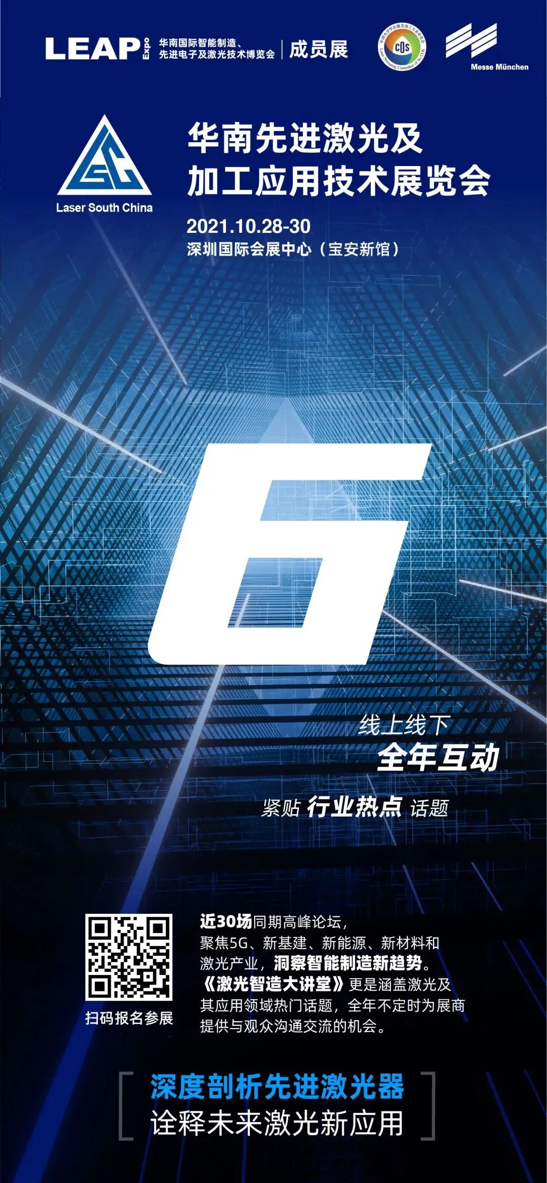 作为LEAP Expo 2021成员展,华南先进激光及加工应用技术展览会(华南激光展)将与慕尼黑华南电子展、慕尼黑华南电子生产设备展、华南电路板国际贸易采购博览会和VisionChina(深圳)同期举办。五展联动,面向华南地区,完整覆盖激光加工、先进光源、先进激光器、自动化及机器人、电子制造智能化解决方案、半导体与系统设计技术、电子元器件、系统及方案、线束加工及连接技术、点胶注胶设备及材料、机器视觉等核心部件和辅件及智慧工厂特色环节,联合产业优质企业,整合顶层优势资源,打造跨行业合作平台。
