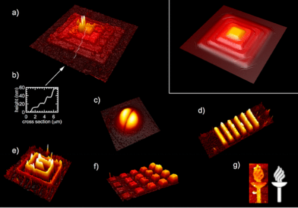 建立3D图案化的方法和机制后,石墨烯的3D结构的制造更复杂。第一个示例是金字塔结构(图4a)。首先制作基础层,然后逐步构建下一个层(图4b中的轮廓),以制造金字塔。 这种金字塔在仿真中也被证明是稳定的。金字塔是对在先前形成的平面结构上重复进行结构形成的可能性的一次有趣的演示,这种渐进式控制可以构建任意复杂的体系结构。另外,研究人员还制造了一个150 nm高的圆形半球,该球已对称塌陷,一个微型光栅、一个螺旋形结构、一个正方形矩阵和一个火炬(图5c-g)。