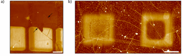 ▲图2. (a) 在空气(顶部)和氮气(底部)下构图的正方形的AFM图像。箭头指出了石墨烯的三角形截面已折叠的位置。(b) 在氮气下图案化的大方块的AFM图像,此外在空气下图案化的中心区域。在左侧图案的较大正方形之后和右侧图案的较大正方形之前,对中心区域进行了图案化。