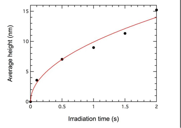 ▲图S1. 高架结构的高度与每个光斑照射时间的关系。高度数据是从图1a中的AFM数据集中提取的。红色曲线表示对辐照时间的平方根拟合。