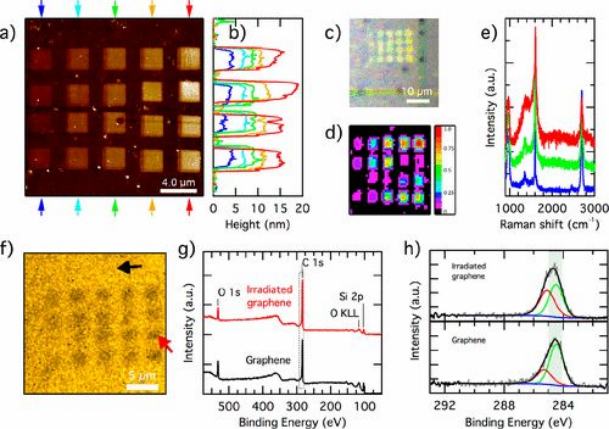 ▲图解:(a) AFM图像。(b) aFM中箭头之间的AFM图像的线轮廓。(c) 光学显微镜图像。底部和右侧的线是30 nm厚和1μm宽的金参考网格的一部分。(d) 拉曼图,显示了在〜1350 cm-1处D波段区域的综合强度。(e) 由石墨烯测得的拉曼光谱,无辐照(底部),每个点辐照0.5s(中)和2s(顶部)。(f) C 1s信号在285.0–284.2 eV处的XPS图像。(g) 未辐照石墨烯(底部)和辐照石墨烯(顶部)的XPS调查光谱。(h) 非照射区(底部;f中的黑色箭头)和照射区(顶部;f中的红色箭头)的XPS C 1s光谱。阴影区域显示了用于在f中构造图像的区域。灰线显示原始光谱。黑线是包含C═C(绿色),C-C(红色)和背景(蓝色)组成部分的拟合。
