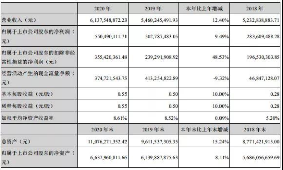 4月9日,华工科技发布了2020年度报告及2021年第一季度业绩预告。根据公告显示,该公司2020年内营业收入为61.37亿元,同比增长12.40%。归属于上市公司股东的净利润为5.5亿元,同比增长9.49%。归属于上市公司股东的扣除非经常性损益的净利润为3.55亿元,同比增长48.53%。基本每股收益0.55元。