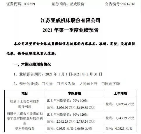 报告期内,亚威股份业务继续呈现加速成长的良好态势,巩固提升了在国内金属成形机床行业细分领域的龙头地位。一季度新签有效合同同比增长61%,环比2020年四季度增长17%,其中数控折弯机、数控转塔冲床等成形机床设备订单皆实现了翻倍增长,激光加工设备订单实现了近80%增长。同时公司持续加快智能升级步伐,加大技术创新力度,优化内部产能效率,经营业绩稳步提升。