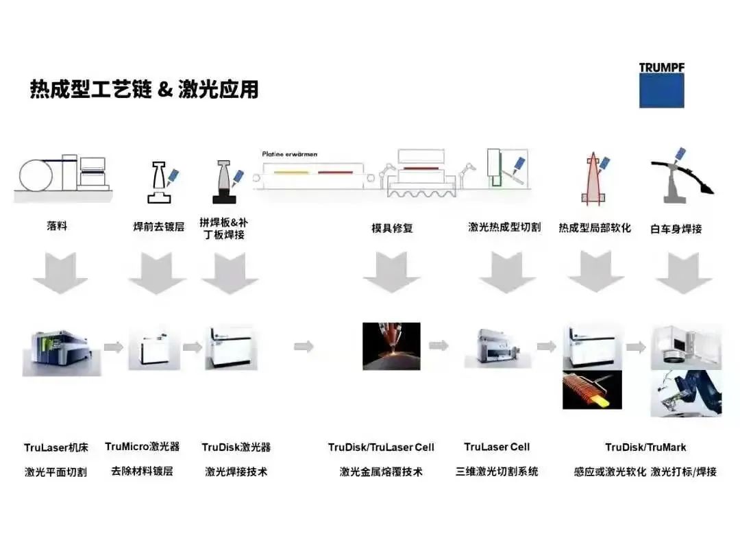 汽车热成型技术从诞生之初到现如今广泛应用,通快一直致力其中,并始终为客户在各个工艺环节提供全套激光解决方案。立足自身在机床和激光领域的数十年技术积淀,通快助力客户实现经济地加工铝合金、纤维强化材料以及如 Usibor 等热成型超强钢。全球汽车前十大零部件供应商里超过 70% 都是通快全球的长期战略合作客户。