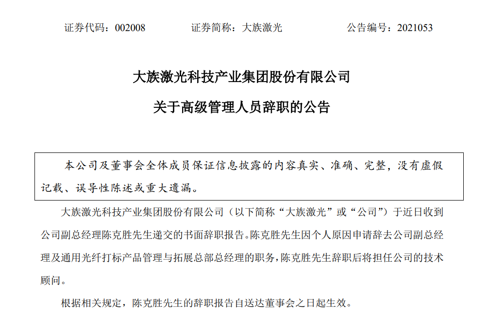 6月23日晚间,大族激光发布公告称,公司于近日收到公司副总经理陈克胜递交的书面辞职报告。陈克胜因个人原因申请辞去公司副总经理及通用光纤打标产品管理与拓展总部总经理的职务,陈克胜辞职后将担任公司的技术顾问。根据相关规定,陈克胜的辞职报告自送达董事会之日起生效。