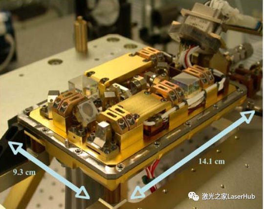 考虑发射成本和效能,星载激光测高仪对卫星有效载荷的体积重量提出了较为苛刻要求。空间应用激光器通常采用棱镜式折叠腔和各组成部分紧凑型密接布阵方式,以及高稳定性和轻量化的光机结构设计来实现激光器的小型轻量化。例如2004年,美国水星激光高度计搭载的空间应用激光器,在结构空间仅为141×93×30mm3的尺寸内,实现了所有功能组件的密接布阵设计,充分利用了每一寸结构空间,成为小型轻量化设计的典型代表。