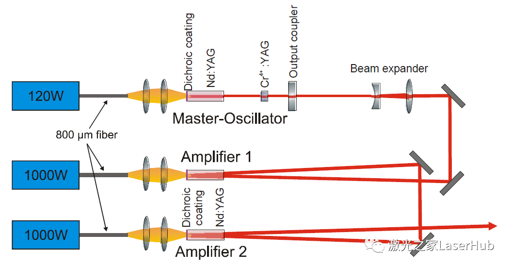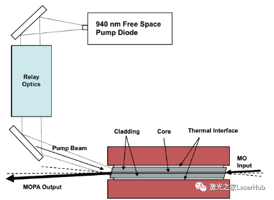 图7 欧洲航天局为水星激光测高仪(BELA)研制的光纤耦合LD端面泵浦的主振荡器双程功率放大器技术方案