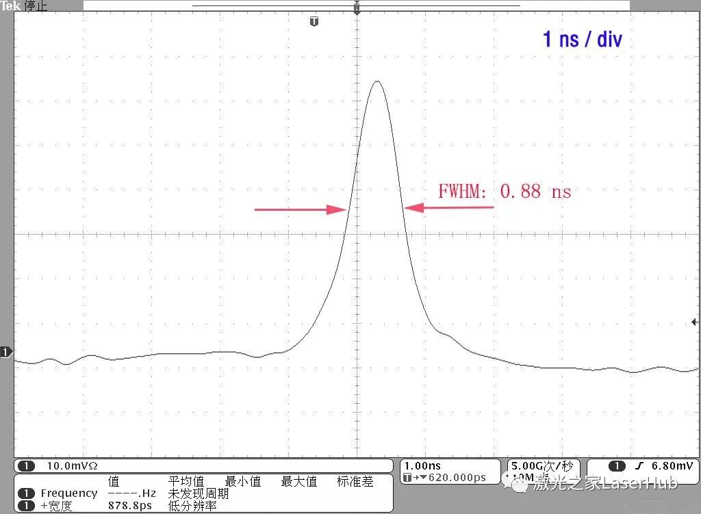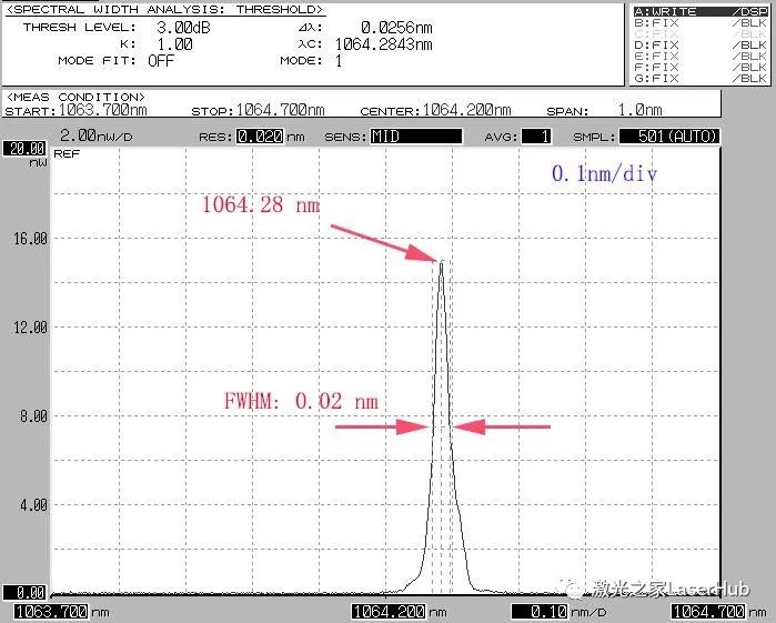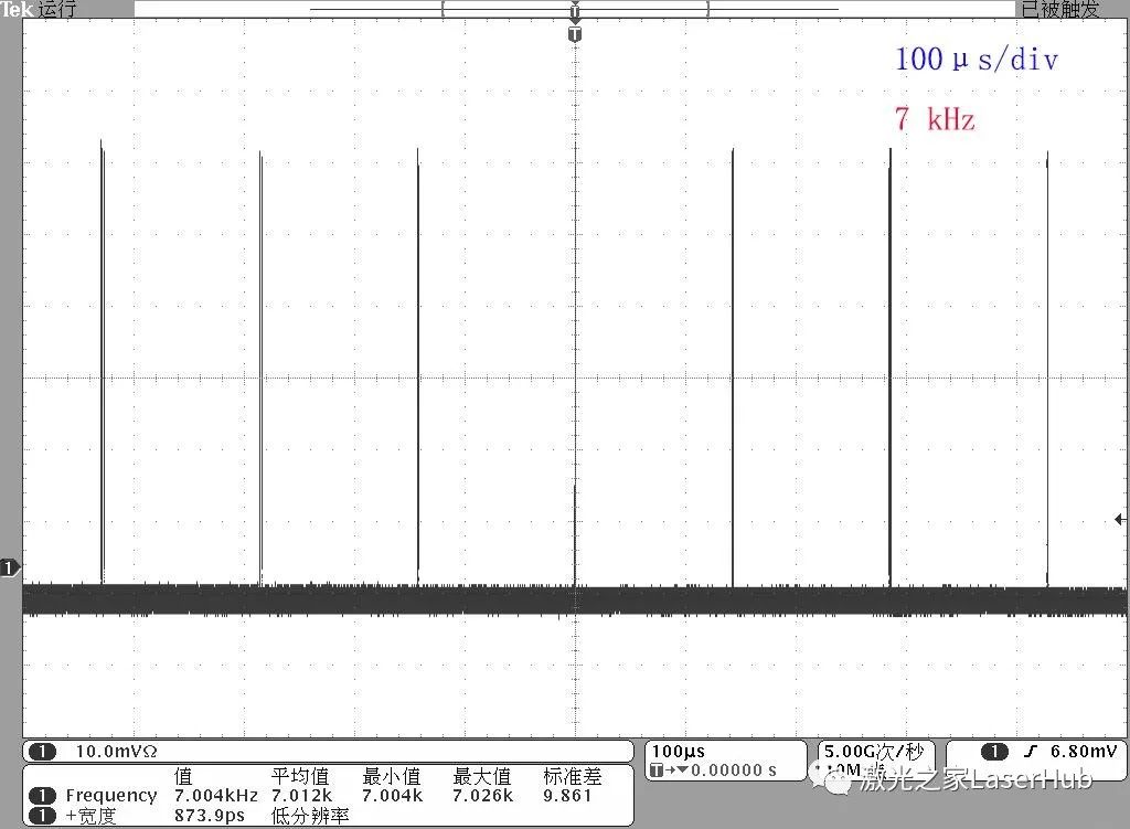 MOPA激光器振荡级采用脉冲泵浦的Nd:YAG/Cr4+:YAG被动调Q激光器,获得线宽0.02nm(中心波长为1064.28nm)、脉冲宽度0.8ns、重复频率7kHz、近衍射极限光束质量的种子光,通过光束整形两次掠入射注入Nd:YVO4薄板条晶体放大,实现了单脉冲能量>1mJ(平均功率为7.3W)的近衍射极限光束质量输出。该样机在25℃连续工作1h,测得中心波长稳定在1064.28nm、谱线宽度0.02nm且无明显ASE效应,输出能量(功率)稳定性达到98.4%,重复频率稳定在7kHz,重频抖动小于10Hz,脉冲宽度稳定在0.8ns。图10~图13为激光器指标测试数据。