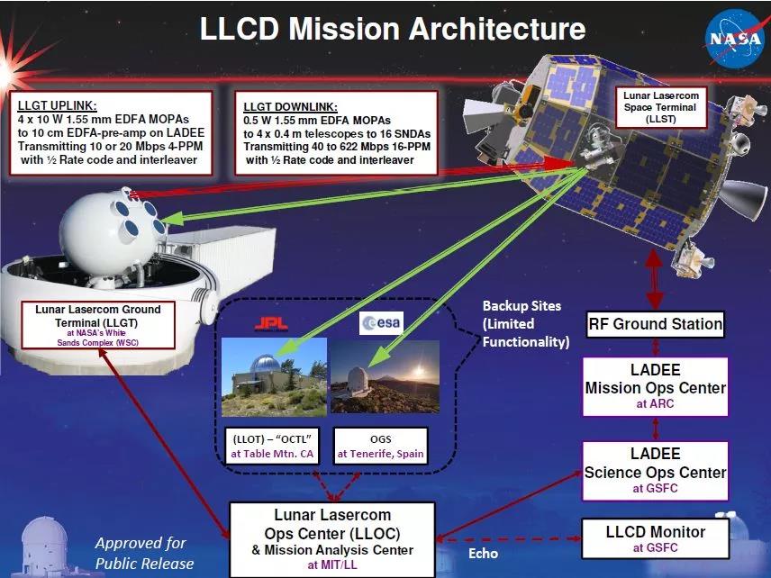 LLCD空间终端也证明,在主地面终端与两个辅地面终端之间2分钟以内进行的常规连接“交接”,这由美国加州桌山NASA喷气推进实验室(JPL)和位于西班牙特纳利夫岛的欧洲宇航局(ESA)提供。LLCD系统由1个LLST(月球激光通信空间终端)、2个地面通信终端——LLGT(月球激光通信地面终端)和LLOT(月球激光通信光学终端),1个LLOC(月球激光通信运营中心)构成。支持下行速率622Mbit/s和上行速率20Mbit/s的月地(通信距离约为40万km)双向激光通信。