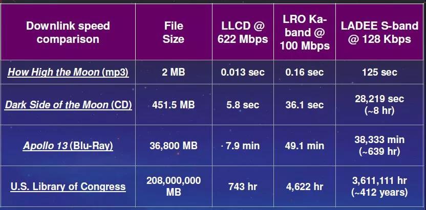 但是,LLCD示范的实际性突破是其近乎完美运行的立场取得的巨大成功,其要求使用的系统要从探月LADEE仪器上返回真实高价值的科学数据以便调查研究月球环境。LLCD空间终端和主要的地面终端证明,每次传输在闭环跟踪15微弧度上行和下行光束后几乎同时采集信号,而在一系列工况下传输零误差数据,包括通过薄云传输,而在白天LADEE宇宙飞船与太阳的夹角在3度以内,并且LADEE和月球与地平线的夹角小于5度。