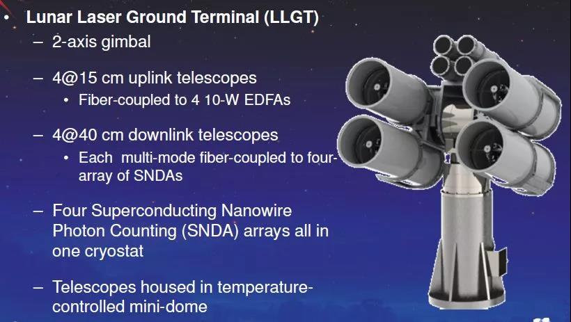LLGT地面终端是一个望远镜阵列。发射天线由4个15cm的折射望远镜组成,接收天线由4个40cm的反射望远镜组成。光接收机采用SNSPD(超导纳米线单光子探测器)探测下行链路光信号,探测灵敏度优于1光子/bit(见下图)。