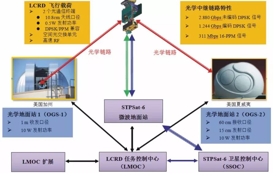 LCRD系统包括2个UEO(地球同步轨道)星载激光通信终端和2个地面激光通信终端。GEO星载激光通信终端是基于LLST终端开发的,计划搭载在一颗商业通信卫星上于2017年发射,支持2年在轨高速光通信试验,通信链路包括GEO卫星与地面站之间的双向激光通信链路,地面站——GEO_地面站的中继激光通信链路。