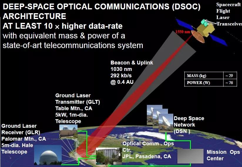 DSOC用于从近地小行星开始向外到木星的工作,并以250Mbps以上的速率从火星反向传输数据(0.42AU或63Mkm),而消耗质量为28千克,功率76瓦。但是,与LLCD相比,DSOC还遇到其他难题,包括l000×以上的链路(链路损耗60dB以上),千瓦级地面上行光束,宇宙飞船上观察上行光束的光子计数探测器阵列以及对数量级改进借助惯性稳定的波束指向和下行光束较大提前瞄准角的需求。
