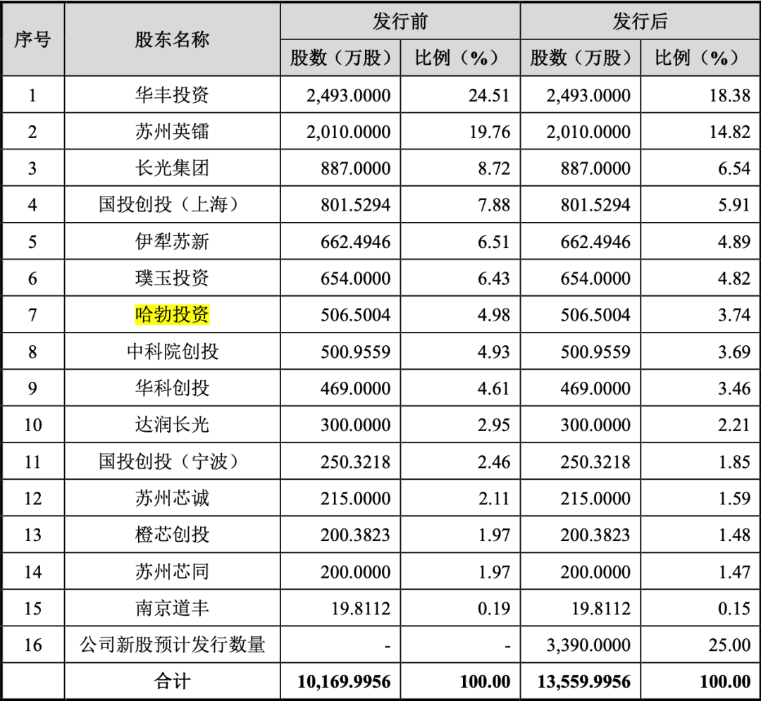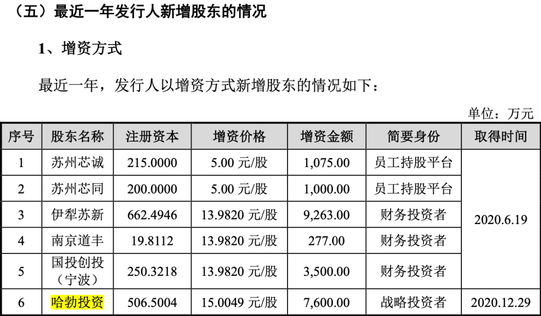 招股书(申报稿)显示,2020年11月,长光华芯整体变更为股份有限公司,随即在12月28日召开股东大会,同意公司向哈勃投资定向增发股份506.5004万股,增资价格为15.0049元/股,增资金额为7600万元。定增完成后,哈勃投资持有长光华芯4.98%股份,跻身公司前十大股东。如果按照半年前财务投资者增资价格13.982元/股计算,哈勃投资参与定增时长光华芯的估值增加7.32%。