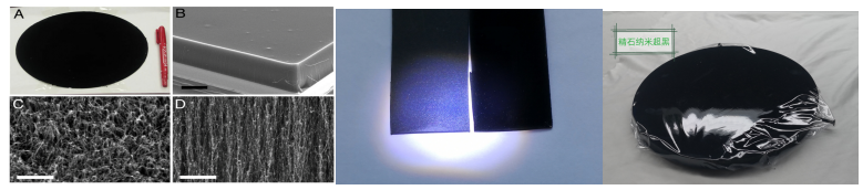 宽波段全吸光超黑镀膜,是指可以将入射到材料表面的的光线,包括紫外光、可见光、近红外光以及中远红外波段的光,几乎全部吸收而基本没有反射的表面处理技术。材料表面对所有入射光的吸收率达到96%以上,最高达到99%以上,总半球反射率低至1%以下,辐射率接近1,已近似黑洞性质。超黑吸光薄膜的制备具有非常大的技术难度,一直是纳米材料科学、表面工程、光电子学等领域的实验室和工业界热门研究方向。