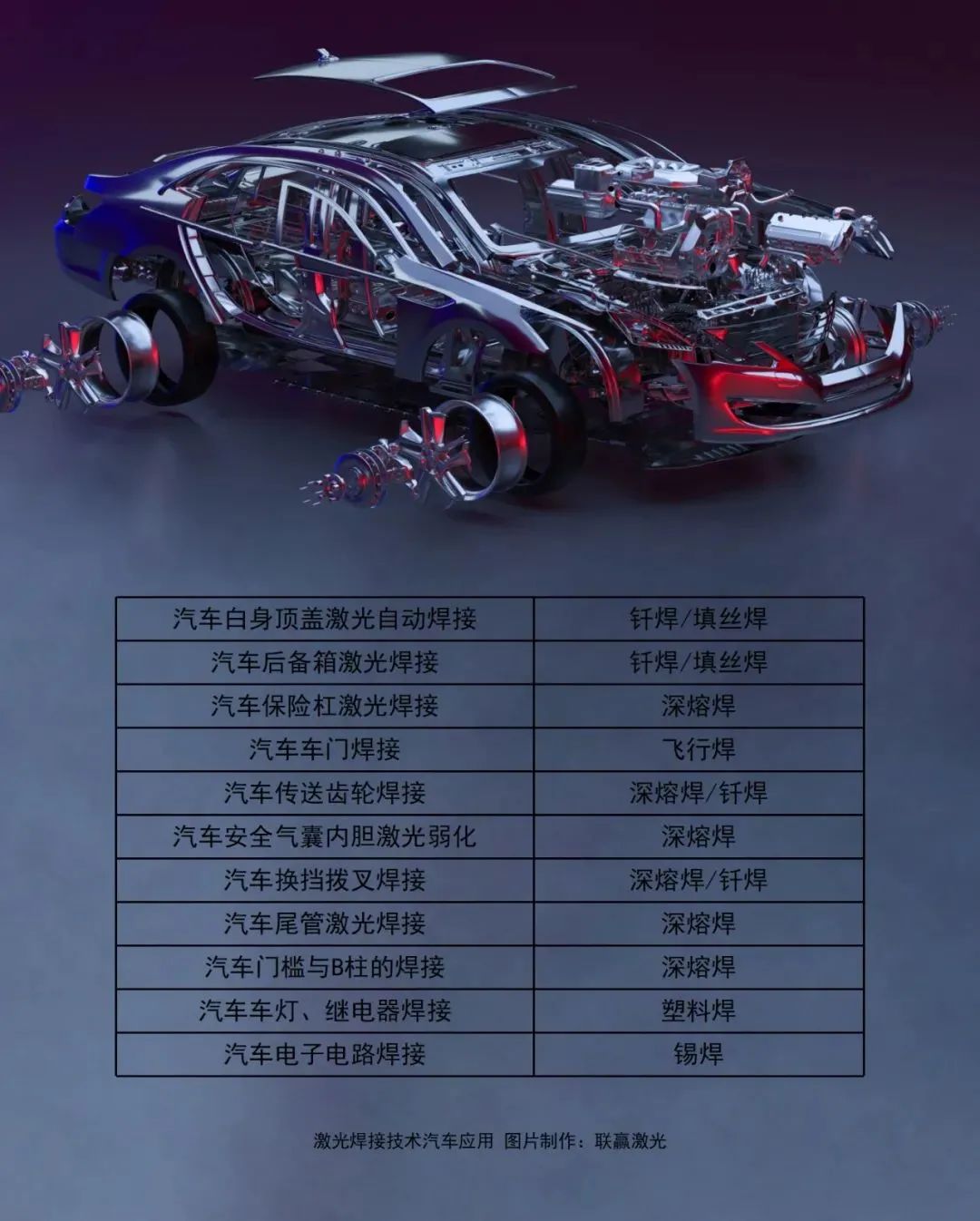 激光焊接在汽车制造中的应用具有高效性与精密性的特点。激光焊接主要用于车身框架结构的焊接,例如顶盖与侧面车身的焊接,传统焊接方法的电阻点焊已经逐渐被激光焊接所代替。用激光焊接技术,工件连接之间的接合面宽度可以减少,既降低了板材使用量,也提高了车体的刚度。