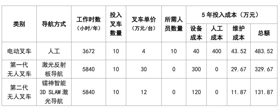 上表假定了某仓库分别投入10辆电动叉车、激光反射板导航叉车、3D SLAM激光导航叉车,并以5年折旧进行投资回报对比分析。显然,人工操作的电动叉车投入成本最高,经济回报效益最低;激光反射板导航叉车虽然单台叉车成本高,但在五年折旧期后总投入还是比人工的电动叉车要节省了153.85万元,近32%的成本;而采用镭神智能3D SLAM激光导航方案的无人叉车,五年总投入成本仅131.87万,比人工电动叉车节省了73%的投入成本、59%的时间成本,而且五年期间仓库可以灵活进行扩建或调整,全面满足工业互联网时代下客户终端市场随时变化的需求,具有更突出的综合效益!