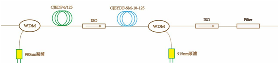 1550nm光纤激光器使用的增益介质是铒纤及铒镱共掺光纤,光纤激光器具有体积小、转换效率高、光束质量好等优点。1550nm光纤激光器使用掺铒光纤对激光进行放大,但是铒离子容易出现团簇现象且高掺杂容易引起浓度淬灭,难以实现高功率输出。因此高功率的1550光纤激光器一般通过980nm泵浦与单模铒纤进行第一级预防大,二级放大则采用915nm泵浦与双包层铒镱共掺光纤完成,见图4所示。