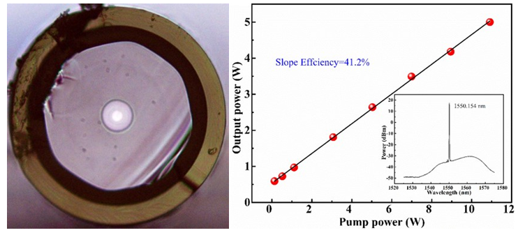 1.5μm光纤激光器的输出功率很大程度上是由增益光纤的性能来决定的,武汉长进激光技术有限公司(简称长进激光)经过多年的技术积累和创新研发,在1.5μm激光雷达光源用增益光纤上率先实现国产化。长进激光自主研发的6/125掺铒光纤以及10/125双包层铒镱共掺光纤已成功应用在红外测距公司的1550nm脉冲光纤激光器中,在一级放大和二级放大系统中的性能上,均达到或超过国外知名厂商水平。图5为铒镱共掺光纤的光纤截面图(左)与斜率效率(右),具有高的光光转化效率,较高的吸收系数保证了输出功率。
