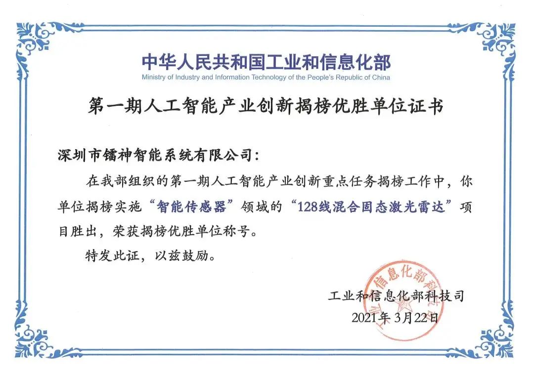 镭神智能集结了研发精锐力量对128线混合固态激光雷达的多方面性能进行技术攻关和持续优化,以“128线混合固态激光雷达”项目入选“第一期人工智能产业创新重点任务入围揭榜单位名单”。本次工信部对揭榜单位评优,镭神智能为广东省唯一入选的激光雷达公司,充分表明了对镭神智能领先的激光感知技术与成果的认可。