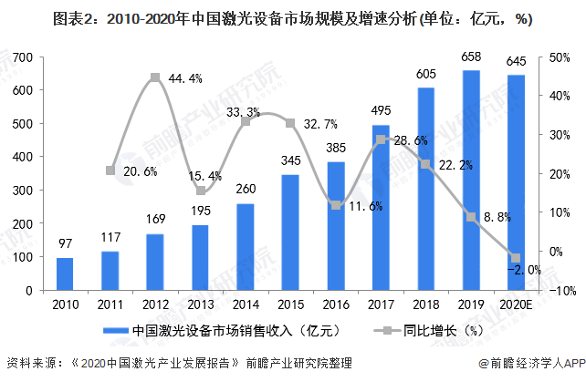 根据2020年3月27日,中国科学院武汉文献情报中心牵头编写的《2020中国激光产业发展报告》发布的数据显示,2010-2019年我国激光设备市场规模呈现逐年增长增长态势。其中,2019年我国激光设备市场实现销售收入达658亿元,同比增长8.8%,增速有所放缓。值得注意的是,受到2020年冠肺炎疫情的影响,全球经济走势不明朗,《2020中国激光产业发展报告》预计2020年中国激光设备市场整体销售收入将会出现10年来首次负增长,约为645亿元。