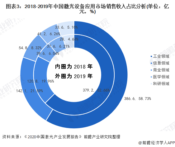 我国激光设备主要应用在工业、信息、商业、医学以及科研领域。根据《2020中国激光产业发展报告》的数据显示,2019年工业领域激光设备销售收入达到386.6亿元,占总收入的58.73%,仍居于首位;其次是信息领域激光设备,实现销售收入为142.1亿元;而激光设备在医学领域的市场份额仅为6.26%,实现销售收入41.2亿元。