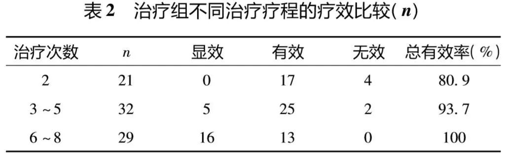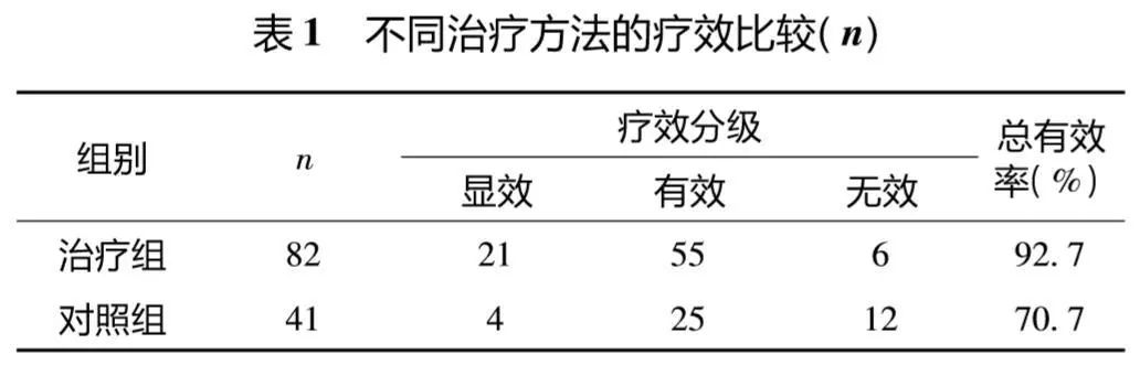 不同治疗方法的疗效比较:治疗组总有效率92.7%的优于对照组的70.0%,差异有统计学意义(x2=10.54,p<0.01)。