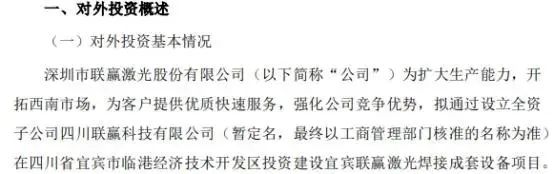 7月19日,联赢激光(688518)近日发布公告,深圳市联赢激光股份有限公司为扩大生产能力,开拓西南市场,为客户提供优质快速服务,强化公司竞争优势,拟通过设立全资子公司四川联赢科技有限公司(暂定名,最终以工商管理部门核准的名称为准)在四川省宜宾市临港经济技术开发区投资建设宜宾联赢激光焊接成套设备项目。项目总投资2.5亿元,分两期建设。