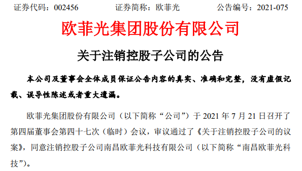 7月22日晚间消息,欧菲光科技发布公告,称公司董事会议通过了注销子公司的议案,同意注销控股子公司南昌欧菲光科技。公示信息显示,南昌欧菲光科技成立于2010年,注册资本8亿元。