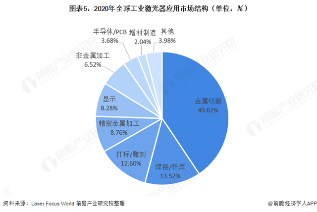 2020年,金属切割应用占整个工业激光应用市场的40.62%,并且继续呈现出增长态势,其中的部分原因是订单的增加。随着新冠疫情在先进制造业国家的传播,切割市场的增长率近年来首次下降到2%左右。其次为焊接/钎焊应用以及打标/雕刻应用,分别占比13.52%和12.60%。
