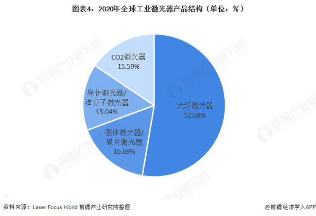 2020年,光纤激光器总收入为27.17亿美元,占据了工业激光器总收入的52.68%;其次为固体激光器,特别是用于金属切割的千瓦级产品,总收入为8.61亿美元,占比16.69%;用于增材制造、精细金属和非金属加工的千瓦级CO2激光器,总收入为8.04亿美元,占比15.59%;主要用于移动通信设备显示器的退火的准分子激光器,总收入为7.76亿美元,占比15.04%。