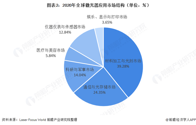 激光器应用领域广泛,Laser Focus World将全球激光器市场分为六大主要细分市场,分别为材料加工及通讯领域、通信与光存储市场、科研与军事市场、医疗与美容市场、仪器仪表与传感器市场以及娱乐、显示与打印市场。